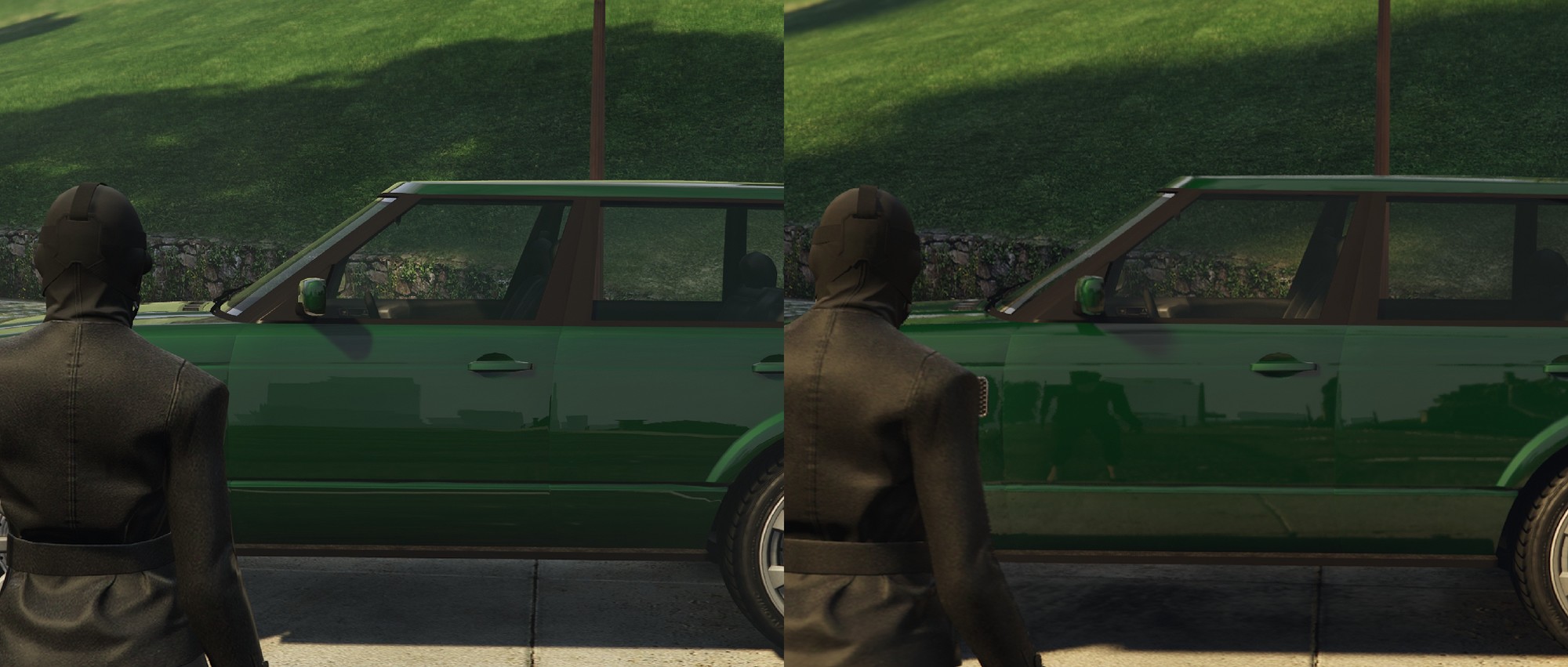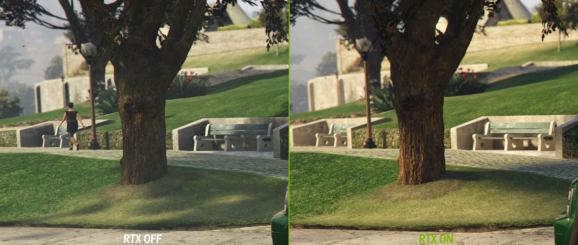 然后是人物脚下的草地。由于在光栅化的设计下,这种草地阴影都是事先烘焙好的,所以与场景光线并没有互动。在开启光追后,草地被阳光照射后,阴影效果自然就愈发淡薄。
