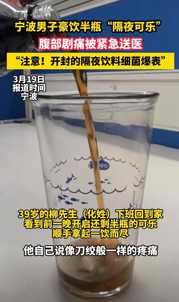3月20日消息,据媒体报道,柳先生喝了半瓶隔夜的可乐,没想到腹部剧痛,伴随着强烈的恶心呕吐感,十几分钟后他被120紧急送至医院抢救室。