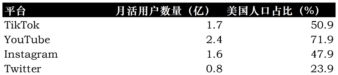 与国内社媒中抖音一家独大的行业格局不同(抖音MAU 11亿,约占中国总人口78%),北美的社媒格局高度分散: