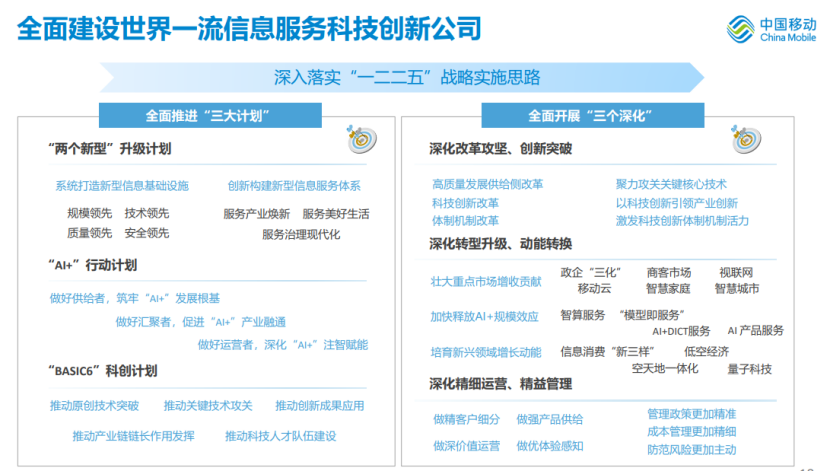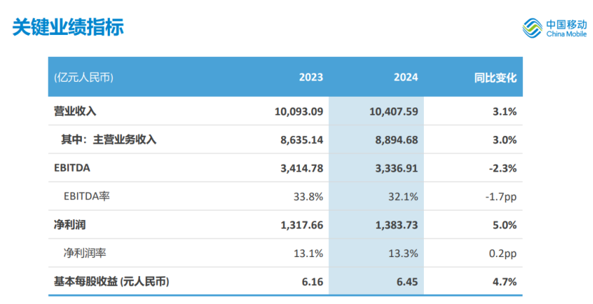 中国移动扎实推进“两个新型”升级、“BASIC6”科创、“AI+”行动“三大计划”,经营业绩表现良好,转型发展成效显著。