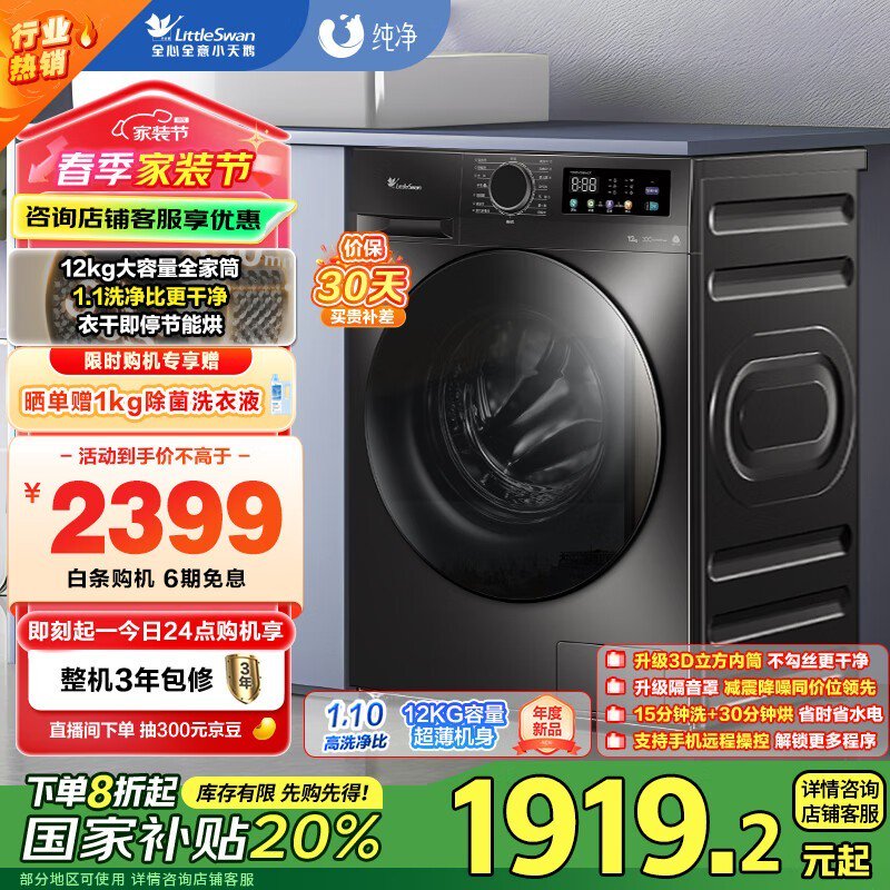 小天鹅洗烘一体机TD120V098WDT京东促销1615元到手