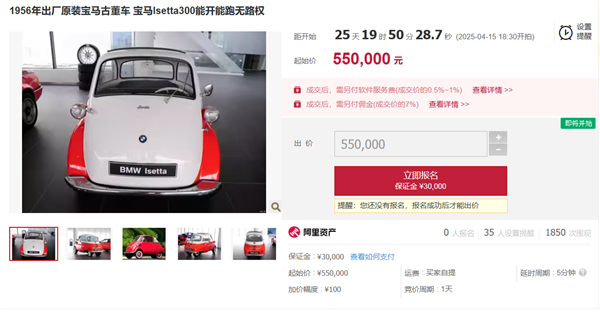 拍卖平台显示,这辆车将于4月15日开拍,保证金3万元,起始价55万,目前尚未有人报名竞拍。