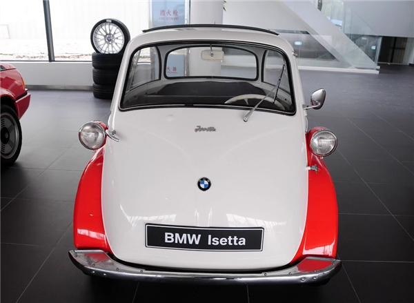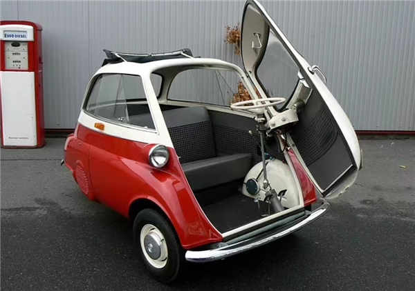 这辆宝马古董车的车身很是迷你,外观颜色为红白搭配,车门的开关方式别具一格,是从前挡风玻璃和机舱盖一起向上掀开,车内只有刹车、油门、离合踏板和方向盘,座椅能够乘坐两个人。