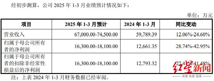 公司还在招股书中披露了2025年1—3月业绩预计情况:预计营业收入约为6.7亿元至7.45亿元,同比增长12.06%至24.6%,净利润同比增长28.74%至42.95%。