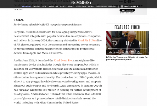《Fast Company快公司》 是全球最具影响力的商业财经杂志,以深入探讨企业家精神、颠覆性创新和市场中的变革力量等主题而闻名。每年该杂志都会评选并发布“最具创新力公司”榜单,以表彰全球最具颠覆性创新能力的企业。《Fast Company》在评选中高度评价XREAL“通过价格亲民、功能强大的AR设备,将混合现实技术引入智能手机、电脑等日常终端,推动消费级AR走向主流”。这一成就源于XREAL持续的技术突破与产品迭代。