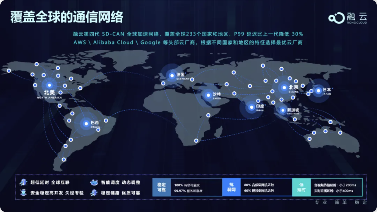 作为全球互联网通信云服务领域的领军者,融云深耕通信云市场多年,打造了覆盖 245 个国家和地区的全球通信网络,拥有 8 大数据中心、数千个接入节点。