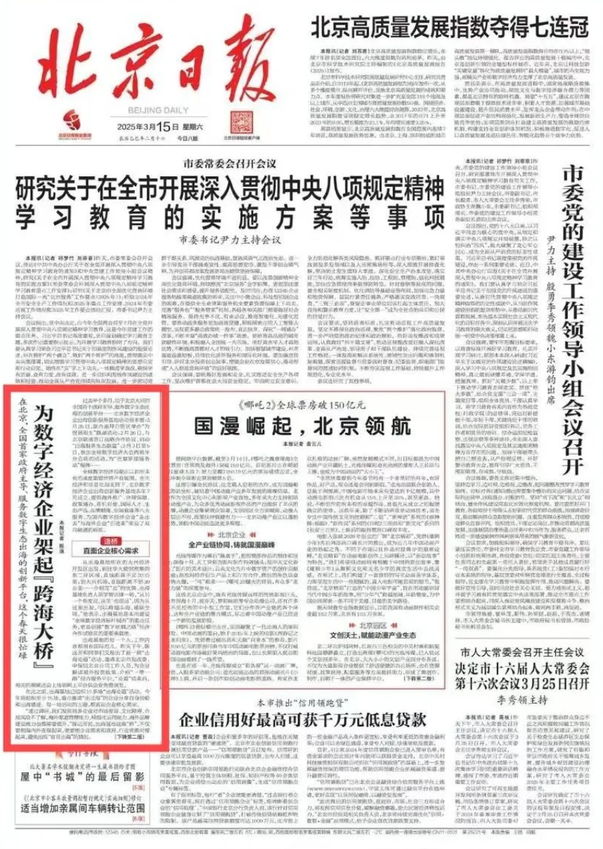 《北京日报》专题报道《为数字经济企业架起“跨海大桥”》,聚焦以通信云技术为核心的数字经济先锋企业“融云”,展示了其通过全球化布局与创新生态构建助力打造“数字丝路”的新范式。