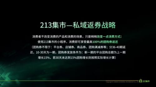 据了解,213集市私域返券战略分批次发放可叠加使用的团购券,通过阶梯式返券设计,引导用户养成周期性消费习惯,将用户消费行为与长期留存挂钩,形成“消费-返券-复购”的闭环,驱动私域留量的持续变现。