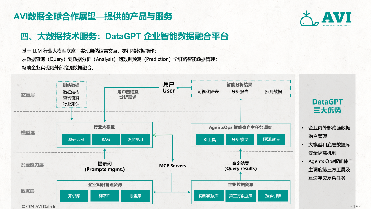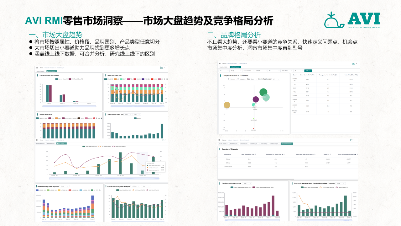作为中国首家面向全球零售与产业链数据市场的第三方大数据机构,AVI data通过搭建一个覆盖全部线下与线上综合业态的零售数据采集网络,并以国家为单位,构建一套以服务多元化企业的出海需求为目标,涵盖零售、2B工程、上下游产业链投资研发生产、渠道分销、用户需求洞察、售后服务,包括全流程和全价值链的大数据采集和研究服务体系,并通过专业的数据挖掘和分析工具、专业的咨询服务、帮助客户做好更加科学的海外市场开发、渠道管理与投融资管理决策,致力于成为中国企业出海的市场考察“望远镜”、市场投放“指南针”和市场营销“倍增器”,推动行业的创新发展,帮助企业实现内外部跨源数据融合,提升市场洞察力和决策效率。