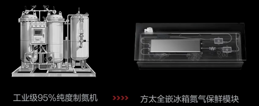 工业制氮机高约2米、重达半吨,方太经过4年攻坚,把这一设备浓缩到高2.52cm,重2kg相当于平板电脑的大小,为保鲜留出了关键空间;