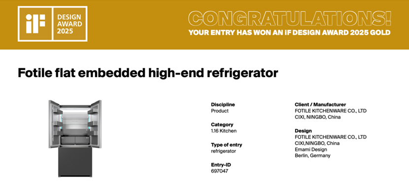 凭借卓越的设计与创新,方太全球新一代高端全嵌冰箱以0.7%的超低概率斩获了2025iF设计金奖,也是唯一摘得该项殊荣的冰箱产品。