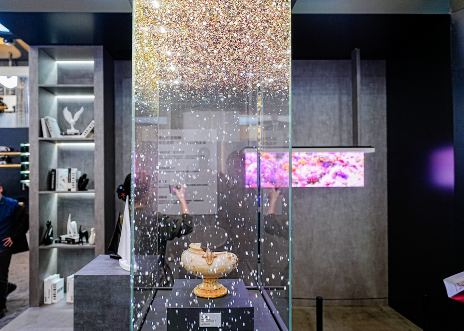 此外,与去年不同的是,今年三星还展出了两款采用透明MicroLED的产品,分别是全息显示产品Holo和镜面显示产品(Cellingdisplay)。Holo通过光源屏幕、透镜板和特别设计的玻璃,可以轻松实现似乎在半空悬浮的全息影像。而Cellingdisplay通过铝和铌微图案化镜片玻璃,将图像显示与镜面效果合二为一,为未来智能化妆镜等场景,提供想象空间。