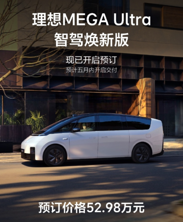 【CNMO科技消息】3月21日上午,理想官方宣布,理想MEGA Ultra智驾焕新版现已开启预订,新车预订价52.98万元,预计五月内开启交付。