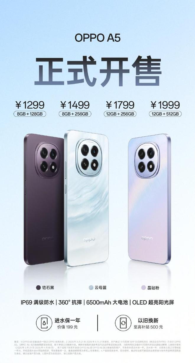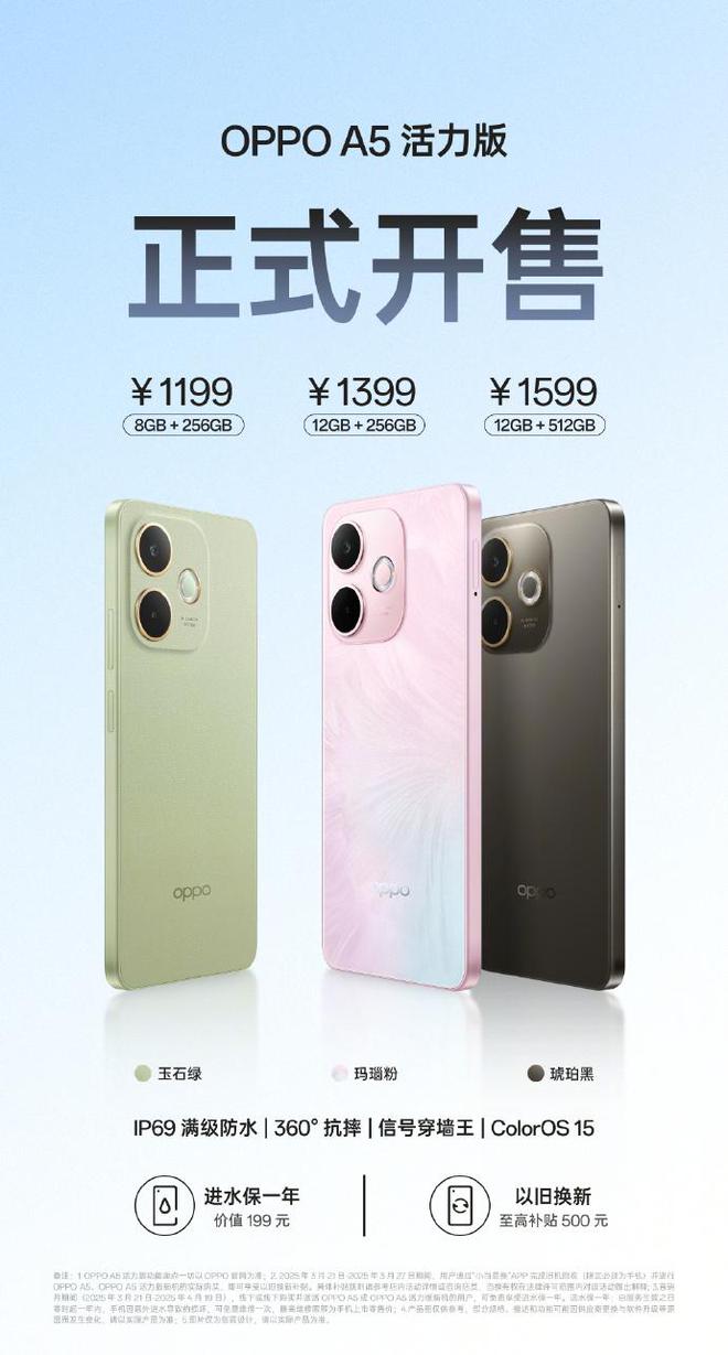 3 月 21 日消息,OPPO A5 / A5 活力版手机今日开售,全系标配 IP69 防水,售价 1199 元起。首销三十天内购机,免费送价值 199 元的进水保一年。IT之家整理产品信息如下。