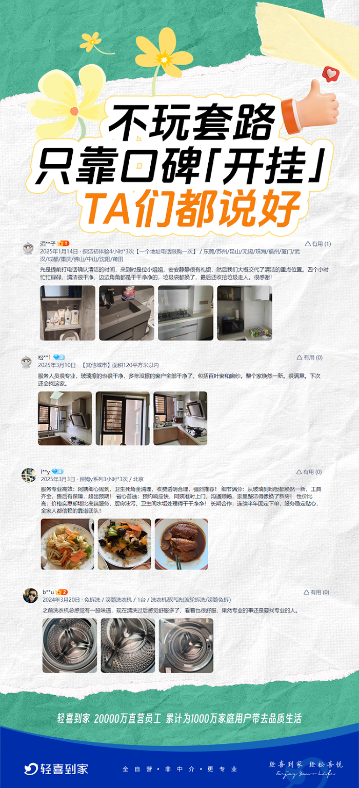 用户口碑就是服务质量最好的标尺。为护航用户美好消费体验,国内互联网+到家服务头部企业——深圳轻喜到家科技有限公司(下称“轻喜到家”)直面行业痛点,升级完善服务保障体系,去年上线“不满意重做”服务广受用户好评,不仅与用户建立起“信任”桥梁,进一步加深品质印记与品牌认知,同时推动家政行业健康有序发展。