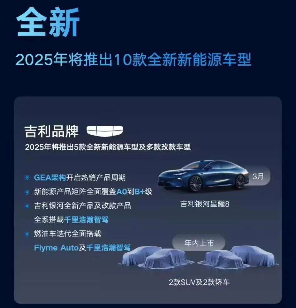 吉利品牌2025年将推出5款全新新能源车型及多款改款车型:吉利银河星耀8现已公布,2款SUV及2款轿车年内上市。