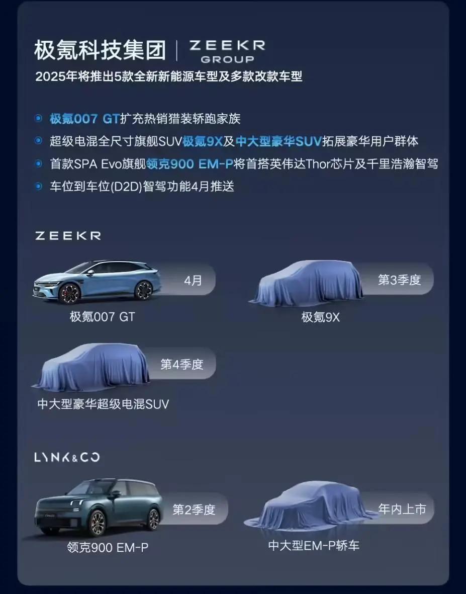 极氪科技集团2025年将推出5款全新新能源车型及多款改款车型:极氪007 GT四月发布,极氪9X第三季度发布、中大型豪华超级电混SUV第四季度发布;领克900 EM-P第二季度发布,中大型EM-P轿车年内上市。