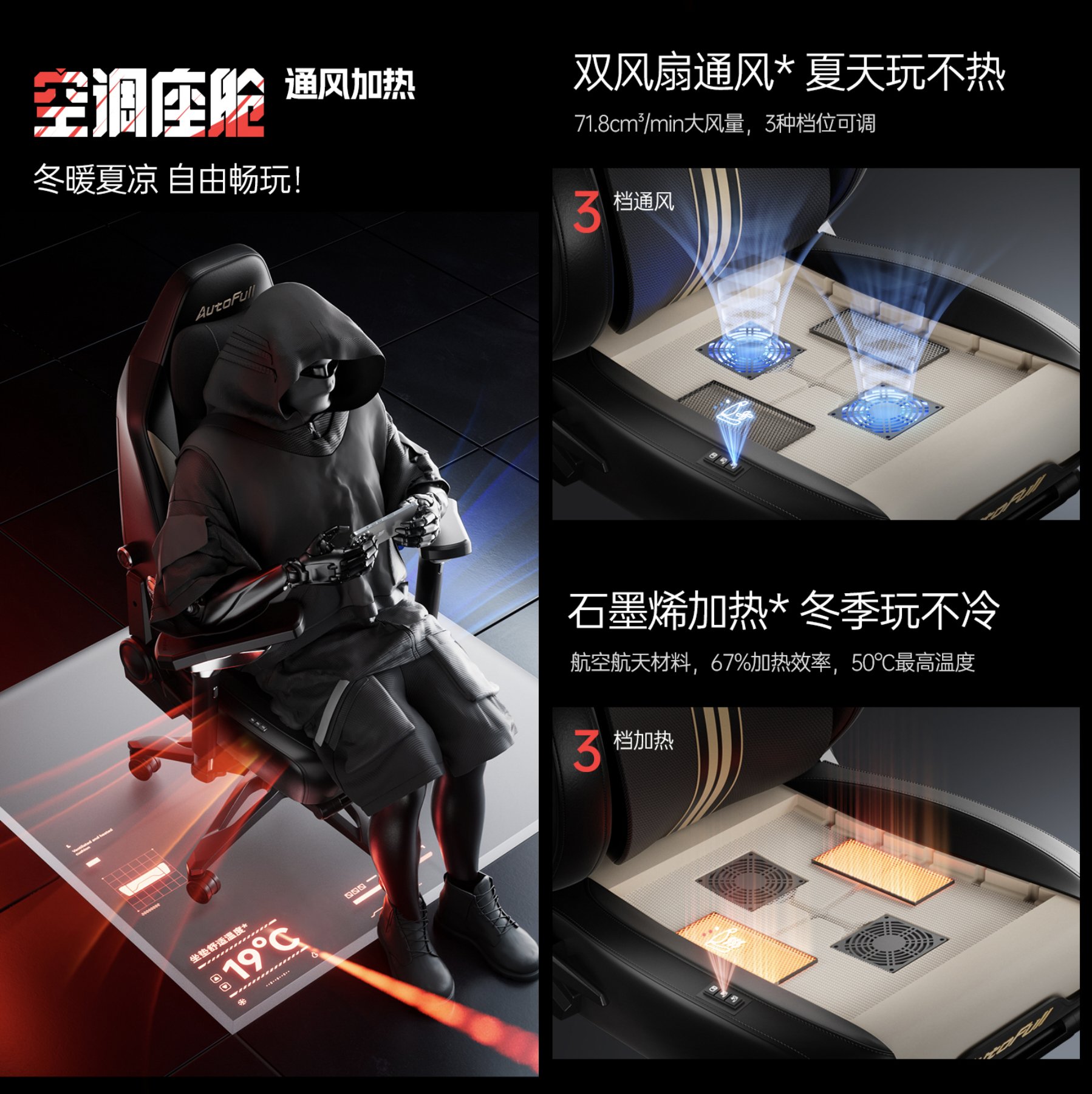 电竞不仅考验玩家的操作和战术,更受环境因素影响。传统电竞椅普遍采用皮质材质,透气性较差,长时间久坐容易闷热,冬季则冰冷难熬,影响竞技状态。为此,傲风M6 Pro+创新推出全球首创空调座舱,让玩家在不同环境下都能保持最佳状态。