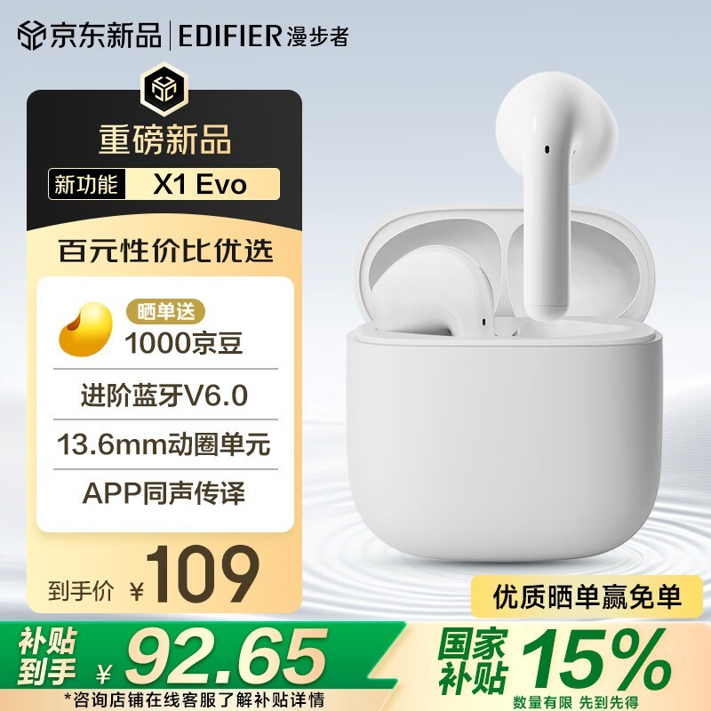 漫步者X1 Evo真无线蓝牙耳机雾面白时尚音质清晰