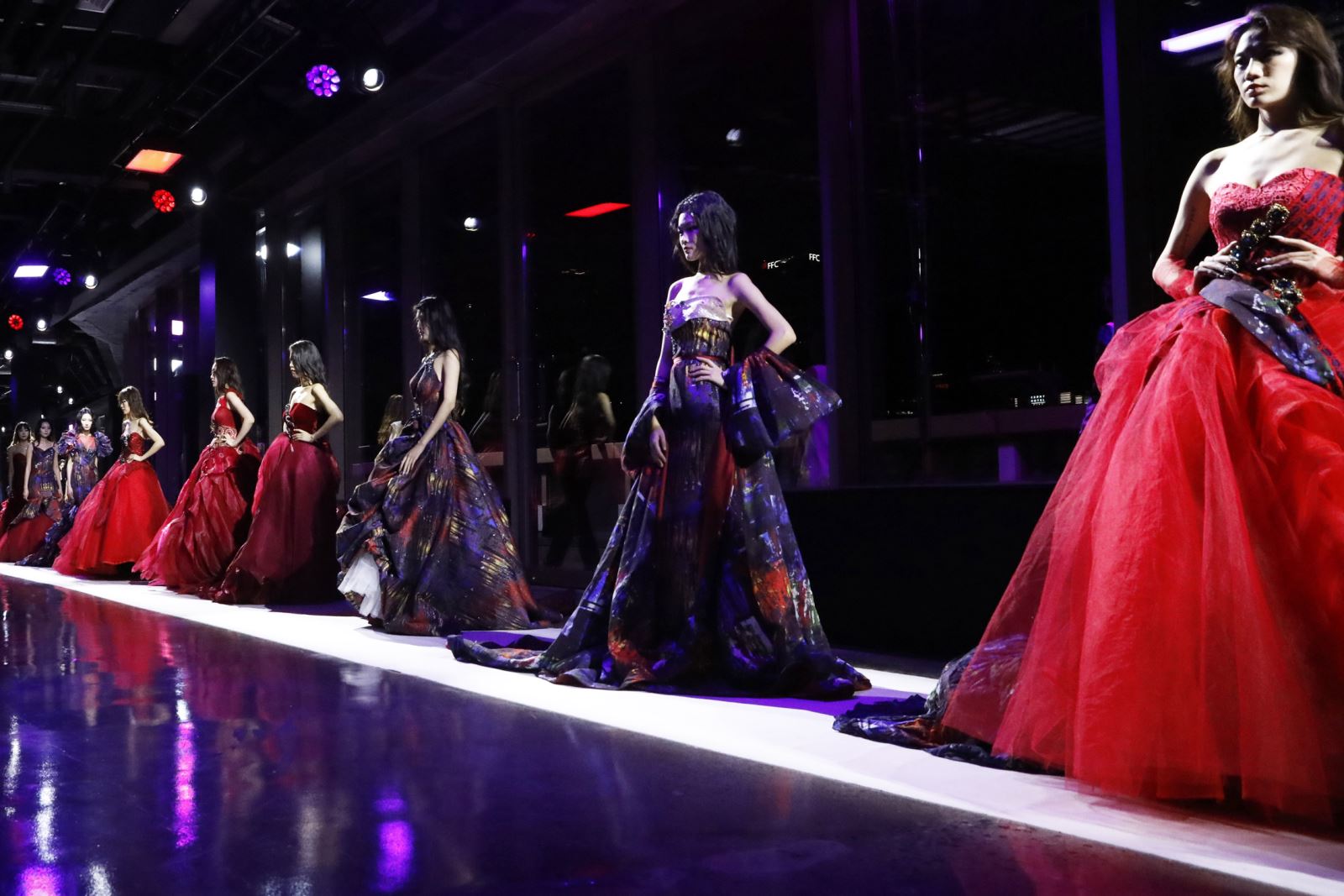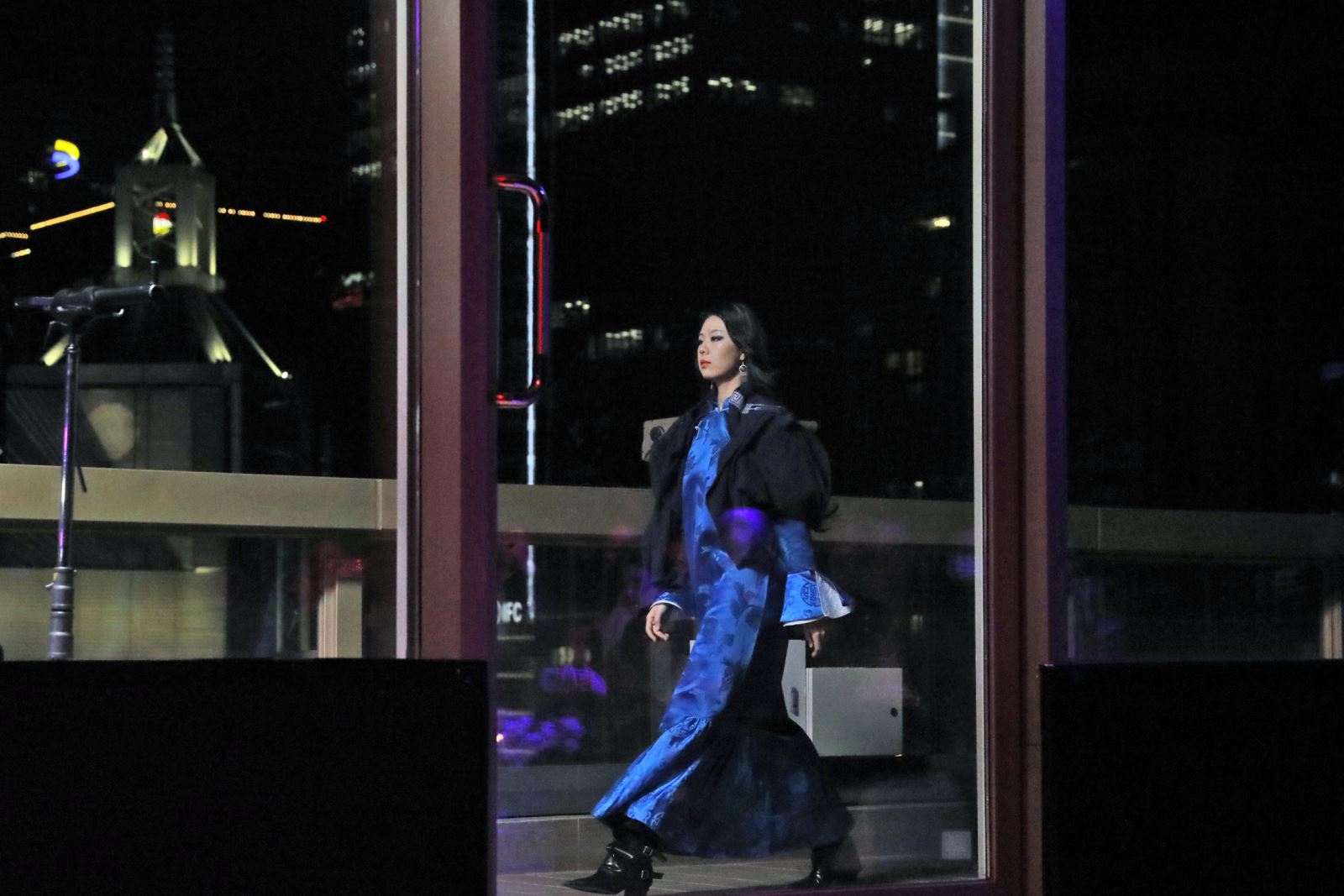 舞台之上,模特身着飘逸丝缎长袍与立体剪裁服装,行走于光影交织的CBD天际线背景中,诠释着“现代都市社交的极致符号”。作为秀水街20周年献礼,本季秀水街秀场首秀由中国顶级时装设计师、两届金顶奖得主张肇达担纲。据了解,此次展示的75套新中式服装,以“北京CBD空中PARTY”为灵感,融合传统五色哲学(黑、赤、黄、青、白)与摩登建筑线条,同时运用苏绣、苗绣、宋锦、香云纱等十多种非遗工艺,在传统与现代、艺术与雅致中表现东方意境。