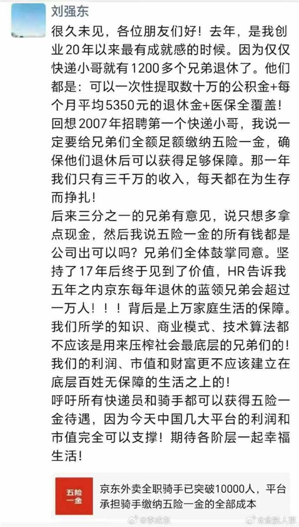 刘强东说,我们所学的知识、商业模式、技术算法都不应该是用来压榨社会最底层的兄弟们的!我们的利润、市值和财富更不应该建立在底层百姓无保障的生活之上的!