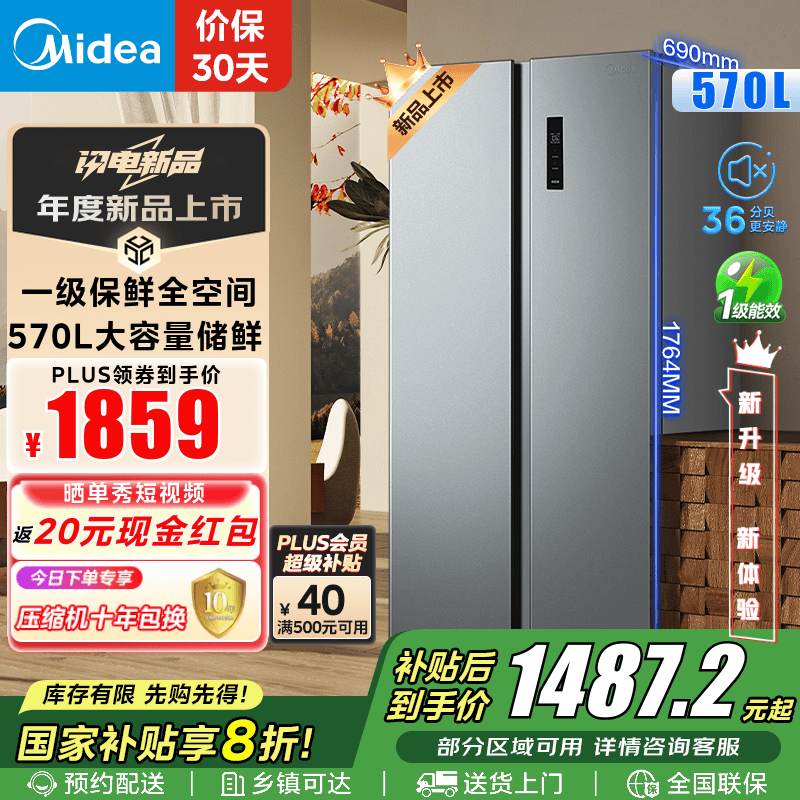 美的570升变频一级能效对开门冰箱仅1464元