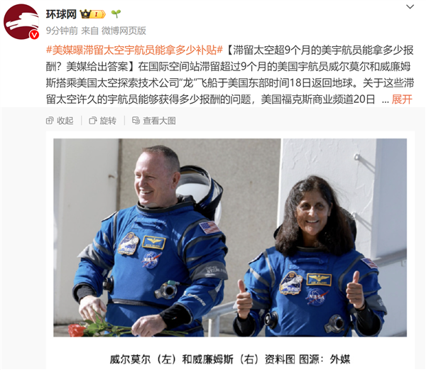 快科技3月21日消息,在太空滞留9个多月的美国宇航员到底能拿多少钱,现在美国媒体给出了具体的答案。