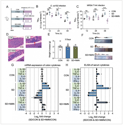 图释义:NMN补充可挽救小鼠肠CR的SD诱导的耗竭。 A)SD诱导的肠道感染模型的实验方案。将小鼠随机分为三组(n=每组6个独立动物),包括CON,SD和SD + NMN组。健康不受干扰的群体; SD,睡眠不足的小组; SD + NMN,睡眠剥离和NMN供应组(NMN:100 mg kg−1每天)。 b,c)在感染后12、24和48 h时小鼠粪便中的细菌载荷。大肠杆菌B2或C)MRSA T144。 D)结肠组织的H&E染色(原始放大倍率:×400)。在SD处理的小鼠中观察到结肠的炎症加剧,如淋巴细胞浸润的病理扩张所表明,以红色箭头为标志。疤痕棒,100 µm。 e)CON,SD和SD + NMN组中小鼠体重变化(n=每组6只独立动物)。 f)三组小鼠结肠的代表性图像。其中,在SD治疗的小鼠中观察到结肠萎缩和粘膜出血。 g)CON,SD,SD + NMN小鼠的结肠样品中炎症细胞因子的RT-QPCR分析。 h)CON,SD,SD + NMN小鼠血清样品中炎症细胞因子的ELISA分析。在(G)和(H)中,比较了两组之间的倍数变化。 CON组用作归一化的参考。