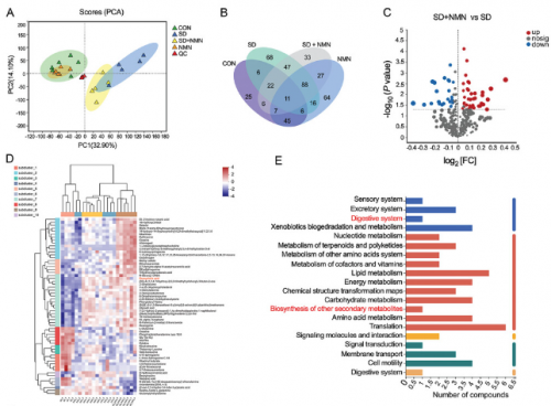 图释义:小鼠四组之间的粪便代谢产物谱的改变。 A)对CON,SD,SD + NMN,NMN小鼠的粪便中鉴定的代谢产物的PCA分析以及主成分(PC)1和2,分别解释了总方差的32.90%,14.10%。 b)维恩图显示了四组代谢物之间的关系。 c)与SD处理的小鼠相比,SD + NMN小鼠粪便中差异富代谢物的火山图。通过LC-MS分析鉴定出差异富集的代谢产物p值≤0.05和FC值≥2,并使用一个垂直和一条水平虚线的黑线区分。分别以红色和蓝色显示了显着上调和下调的代谢产物。肠道中没有明显变化(鼻子)的代谢产物以灰色显示。 d)对来自CON,SD,SD + NMN,NMN小鼠的粪便样品中前50个代谢产物的热图分析(n=每组6种生物学独立的动物)。颜色表示样品组中代谢物的相对丰度,颜色梯度与值之间的相应关系显示在梯度色块中。 DCA被标记为红色。e)