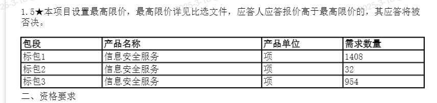 顾名思义,该项目主要采购网络安全服务,划分为3个标包,各选一名中标人,兼投不兼中。从标包信息来看,标包一的采购数量明显高于其他标包。