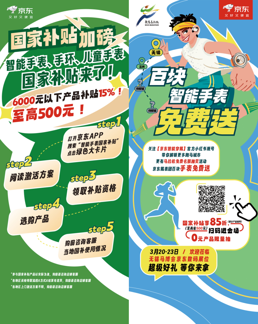 那么在马拉松赛事中,京东带来的互动玩法和实在福利又有哪些呢?感兴趣的跑友们赶紧看过来!参与无锡马拉松赛事的参赛者,可在赛前关注京东智能穿戴官方小红书账号,不仅能解锁更多跑马城市,还有马拉松免费名额抽奖活动。更值得一提的是,此次“京东戴表团”带来了百块智能手表免费送福利,仅需在3月20日到3月23日期间打卡京东数码展位即可领取。此外,针对许多跑友需要入手智能手表等马拉松参赛装备的消费需求,京东还带来了6000元以下产品补贴15%的优惠力度,需要入手的消费者仅需打开京东APP搜“智能手表国家补贴”进入会场,即可按照指示领取补贴资格并轻松下单享受补贴。