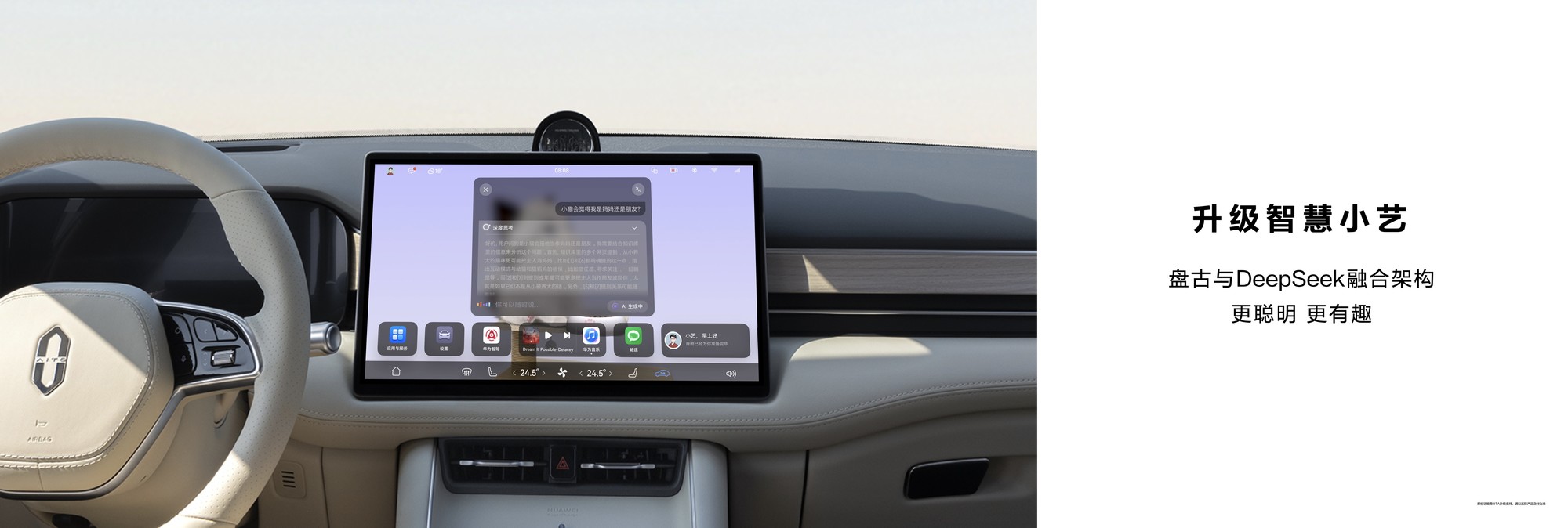 基于全新的盘古与DeepSeek融合架构以及对于用户智能座舱的深度理解,鸿蒙智能座舱打造出了能够独立深度思考、能够基于座舱空间与需求理解进行车辆控制、提供专属个性化服务的车载AI新体验。