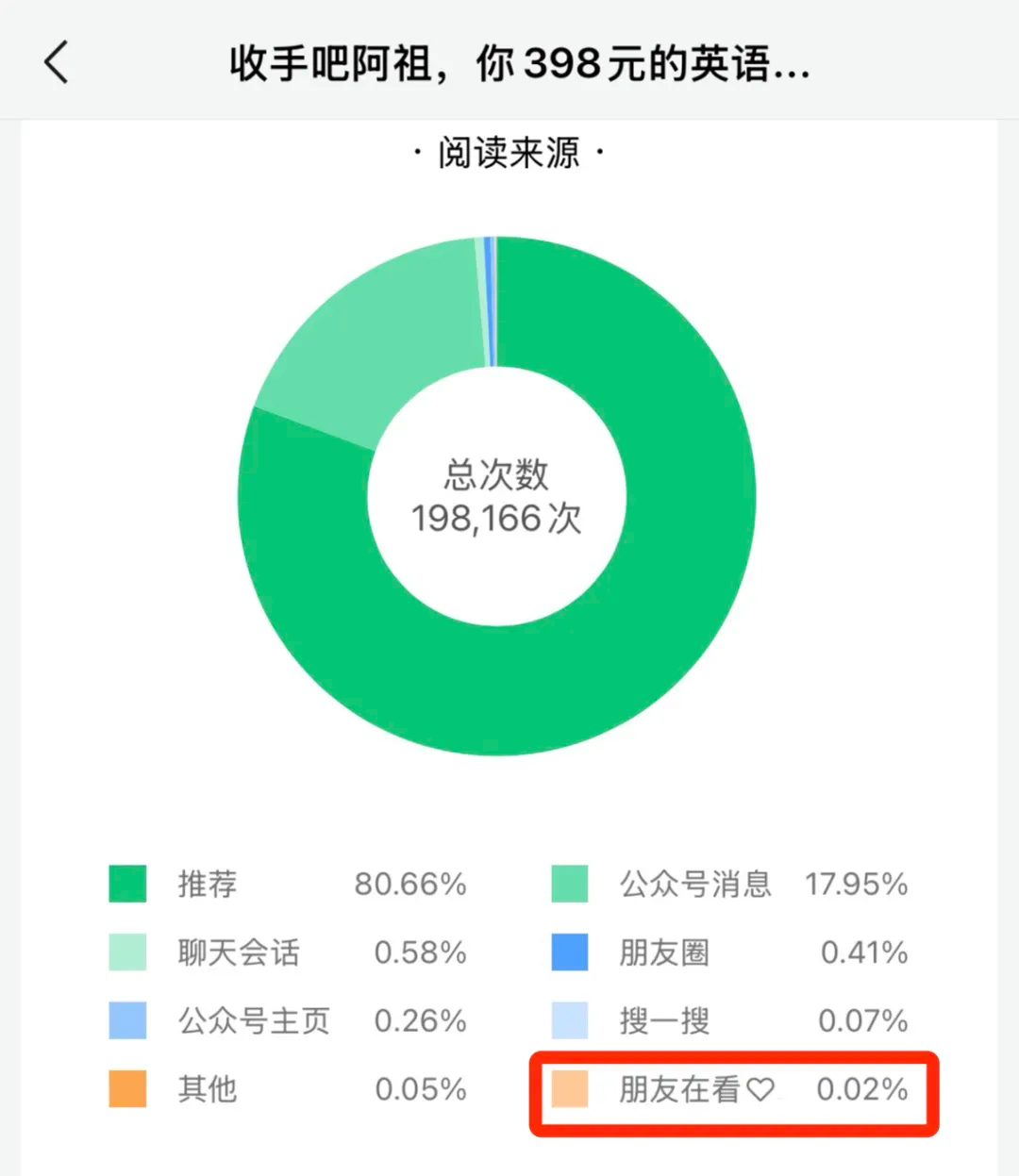反映到阅读量上,“朋友推荐”在该篇文章的占比并不算高,仅有0.02%。