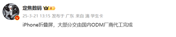 【CNMO科技消息】3月21日,有数码博主爆料苹果iPhone折叠屏手机将主要交给国内的ODM厂商代工。所谓ODM厂商,指的是那些不仅能生产还能提供从设计到研发、后期维护等全方位服务的制造商。与OEM厂商只负责生产不同,ODM厂商以其设计能力著称,可以根据品牌需求或市场趋势开发完整的产品方案。这种方式的一大优点是快,品牌方无需投入大量资源进行研发和生产,可以迅速推出新产品。