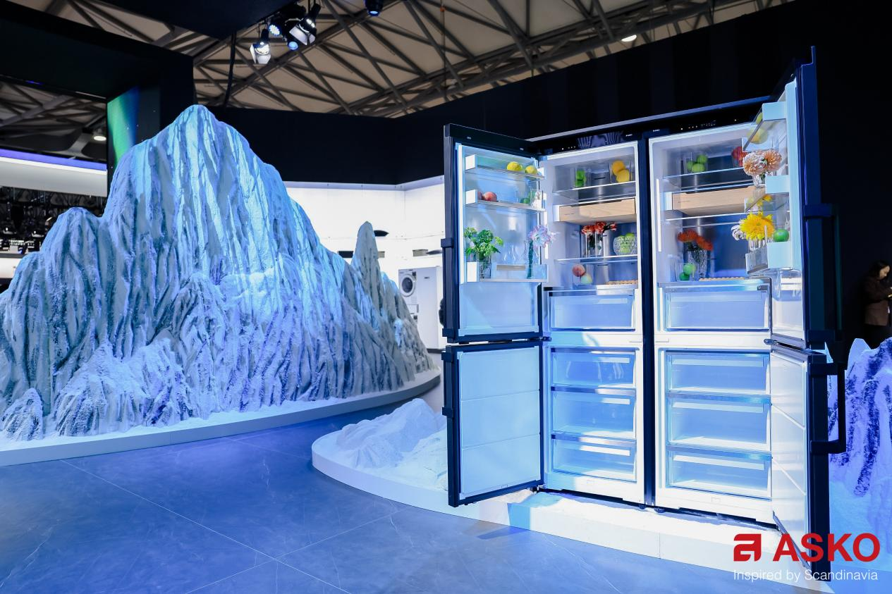 走进ASKO展厅,第一视觉是以冰川秘境为灵感的洗衣房造景,巨型冰山造型艺术装置与金属质感产品交相辉映,瞬间将参观者引入凛冽而纯净的北欧极地幻境。