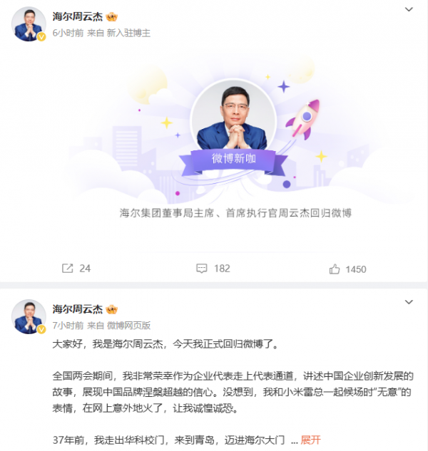 3月21日,海尔集团董事局主席、首席执行官周云杰在微博发文表示正式回归微博。周云杰在文中写道:“全国两会期间,我非常荣幸作为企业代表走上代表通道,讲述中国企业创新发展的故事,展现中国品牌涅槃超越的信心。没想到,我和小米雷总一起候场时“无意”的表情,在网上意外地火了,让我诚惶诚恐。”“网友都说我这次出圈了。我觉得,这次出圈,最大的收获,不是让网友认识了我个人,而是让海尔站在了大家面前,拉近了海尔与消费者的距离。”目前,周云杰已开通抖音和微博账号,认证均为“海尔集团董事局主席、首席执行官”。
