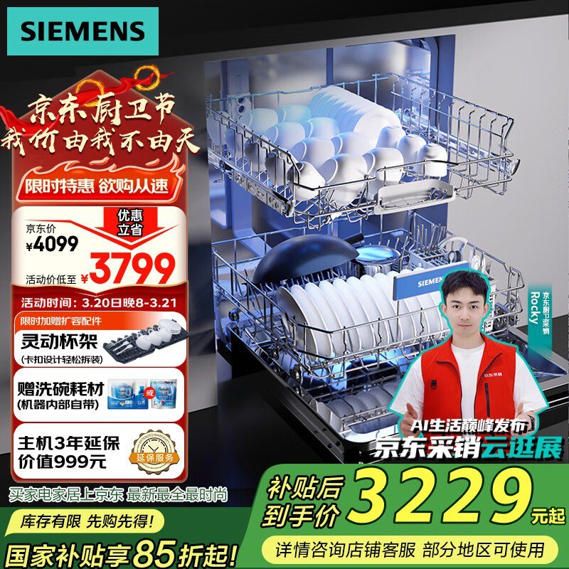 西门子SJ23HB66KC嵌入式洗碗机14+2套大容量仅2871元
