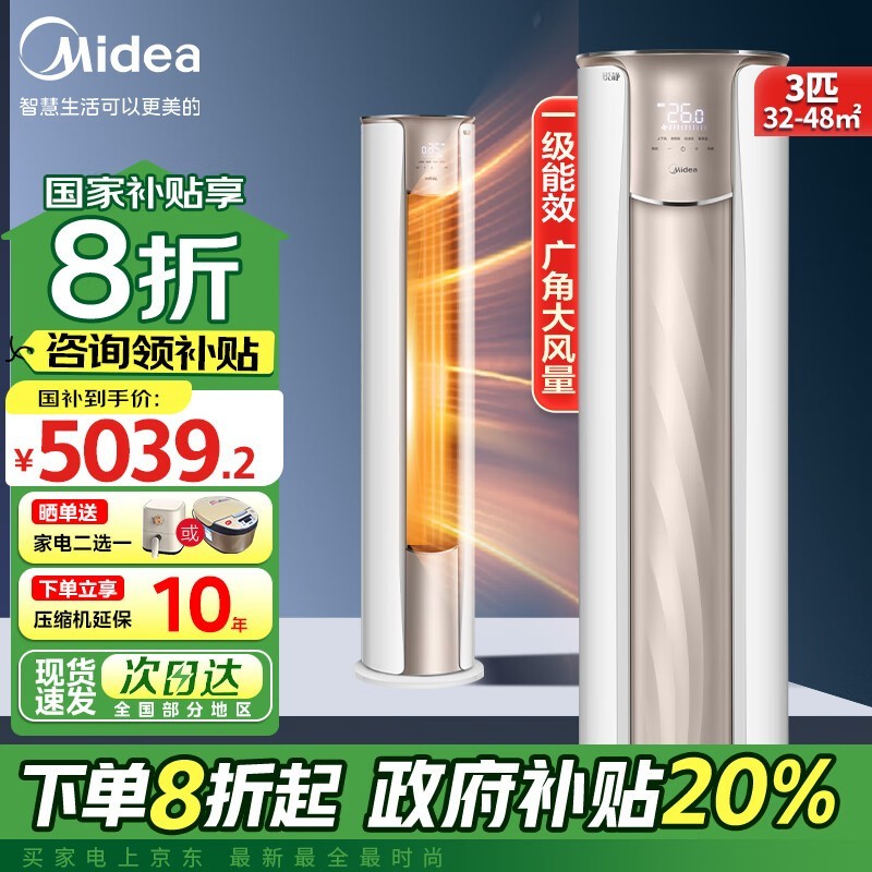美的3匹立式柜机空调一级能效变频省电大风口设计静音舒适享
