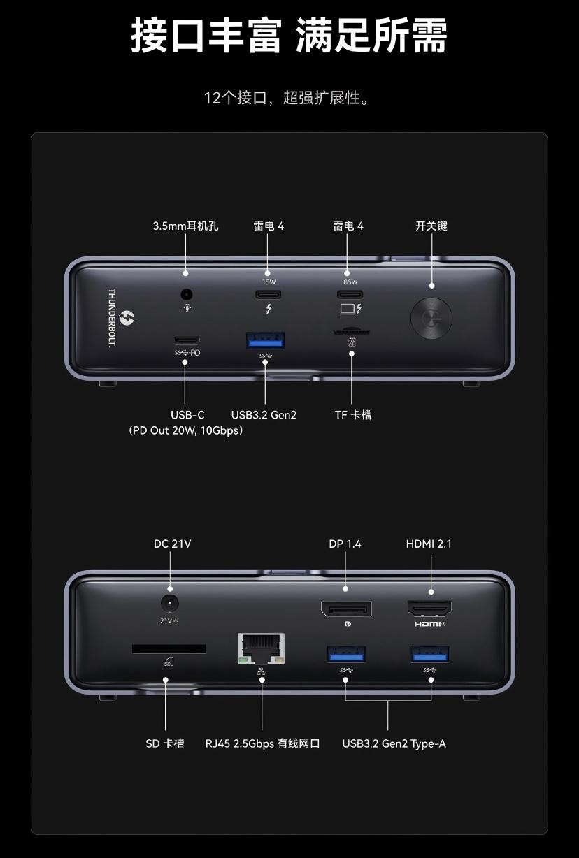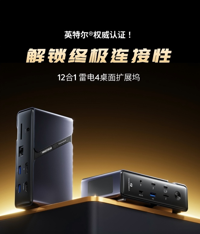再看看铭凡的雷电拓展坞T4DA1(TB4-01),它简直是数码设备的超强辅助。拥有180W功率,内置英特尔IHL 8440 Goshen Ridge处理器,支持WiFi 7 和蓝牙5.4,网络连接快速又稳定。丰富的接口配置堪称一绝,不仅有多种视频、音频输出接口,实现三屏显示,还有多个USB接口、以太网接口以及 SD、TF卡槽等,组成12合1扩展接口 ,轻松连接各种设备,满足你在不同场景下的多样化需求。而且它便携式的设计,方便携带外出,随时随地为你的设备拓展功能。