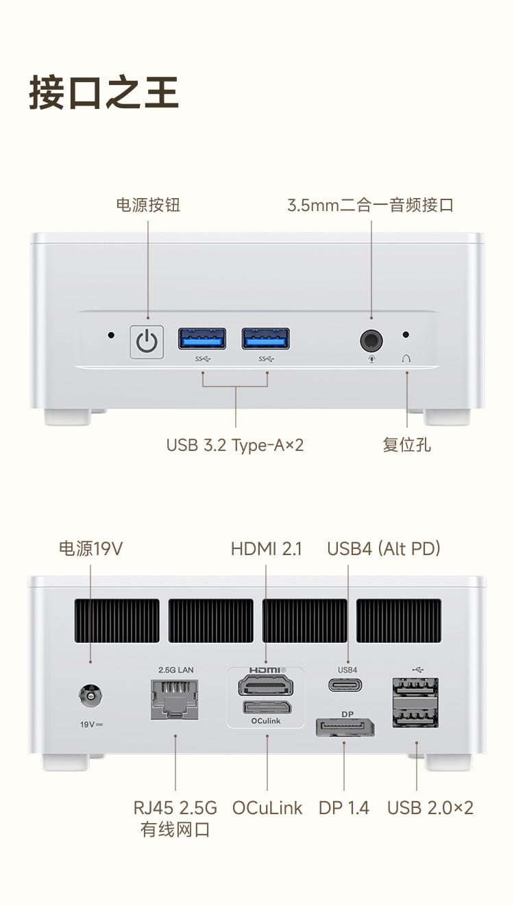 它身材小巧玲珑,往桌上一放,几乎不占空间,桌面瞬间整洁清爽,心情都跟着变好了。接口配置超豪华,正面的电源键、高速USB3.2 Gen2接口、支持PD供电和视频输出的USB4 Type-C接口,还有音频接口,不管是外接设备,还是充电传输,统统轻松搞定。