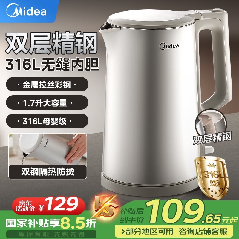 美的316L不锈钢电热水壶1.7L大容量双层防烫设计促销中