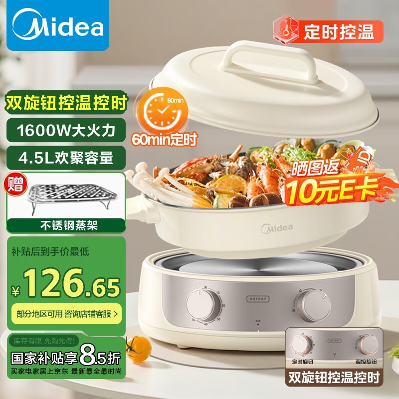 美的HGE3036多功能电火锅4L大容量蒸煮两用仅103元