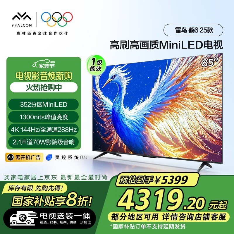 雷鸟鹤6 85S595C电视288Hz刷新率游戏爱好者京东活动价3431元