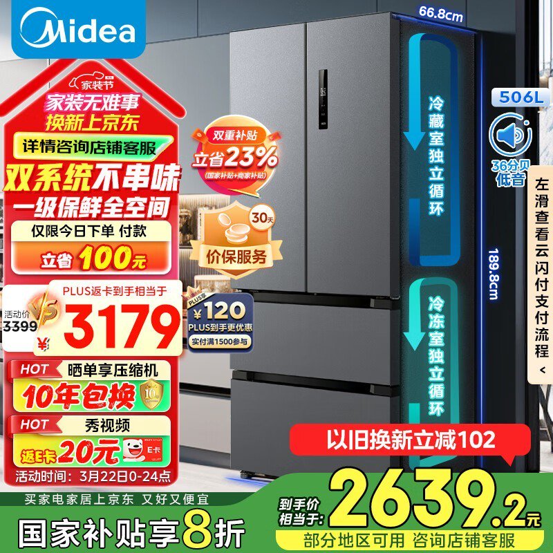 美的MR-532WFPZE风冷多门冰箱京东活动价2264元