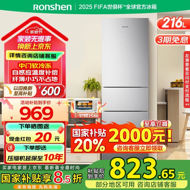 容声风冷三门冰箱216L,活动价682元起