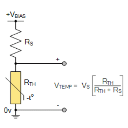 因为通过电阻的电流总是会在其上产生电压降,所以我们可以使用固定的外部激励电压和串联连接的NTC热敏电阻和固定值电阻来产生输出电压,如图所示。