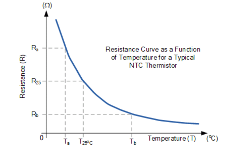 曲线匹配的热敏电阻以其在室温(25°C)下的电阻值为特征。但与其他传感器不同,NTC热敏电阻是非线性器件,这意味着表示电阻与温度关系的图表上的点不形成直线,而是如下图所示:
