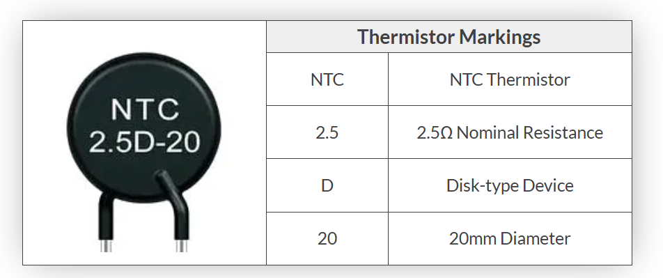 因此,给定的NTC热敏电阻示例是一个20毫米直径的盘式热敏电阻,其在室温下的电阻值为2.5Ω。