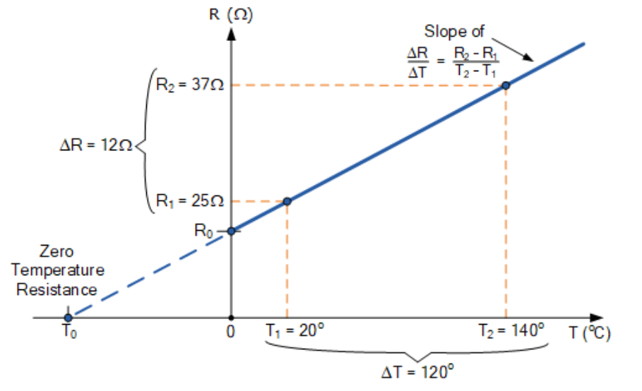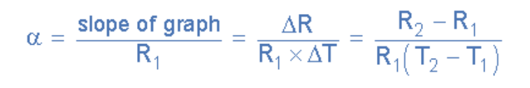 知道图表的斜率值后,我们可以计算材料在任何温度下的电阻,因为电阻温度系数(α)可以通过以下公式计算: