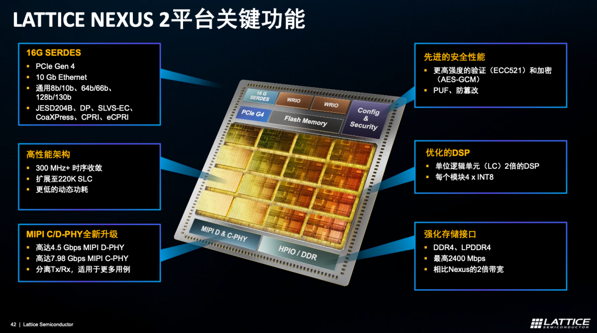 安全性上,为了确保数据完整性和器件可靠性,莱迪思Nexus 2集成了先进的安全特性,包括256位AES-GCM、SHA3-512、ECDSA和RSA,符合FIPS 140-3 2级标准,功能片内集成Flash、快速启动,以及“FPGA设计和用户数据传输安全”,用以抵御“后量子时代的潜在威胁”,满足客户移动数据安全需求。
